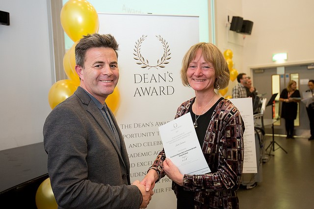Caption: Photo shows Sally receiving her award from David McGravie, Head of the School of Arts at a ceremony at the University of Derby.